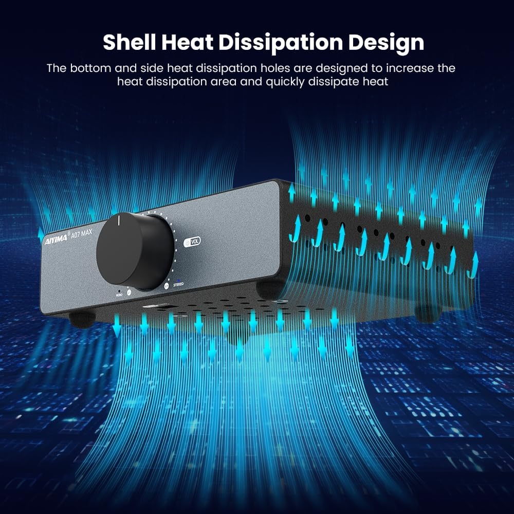 ❶【300W+300W Stereo Amplifier mode】Dual function switchable Stereo/Mono 300W/600W amplifier.AIYIMA A07 MAX Power Amplifier can use as a 2 Channel Audio Component amplifier for Passive Bookshelf Speakers Desktop Home Theater,the max output power up to 600Watts(300W *2 under@4 ohm), can drive 2-8Ω speakers, providing spacious and clean sound quality. Its compact size makes it suitable for a variety of applications, easily setting up your bookshelf/desktop/home theater.The AIYIMA A07 Max is the best match on the market for different types of speakers and the sound quality of the A07 Max is excellent